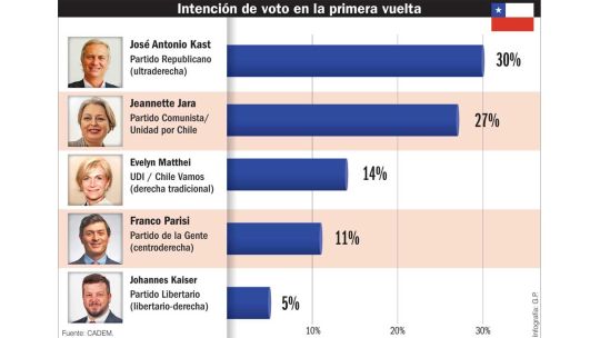 Tendencias. El último sondeo de la consultora Plaza Pública Cadem muestra un ascenso en la intención de voto de Kast y un leve descenso de Jara, quien lideraba hasta hace unos días las encuestas.