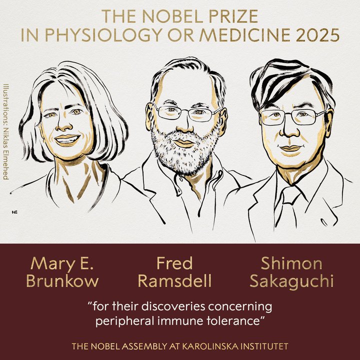El Premio Nobel de Medicina o Fisiología de 2025 fue otorgado este lunes a Mary E. Brunkow, Fred Ramsdell y Shimon Sakaguchi «por sus descubrimientos sobre la tolerancia inmune periférica».