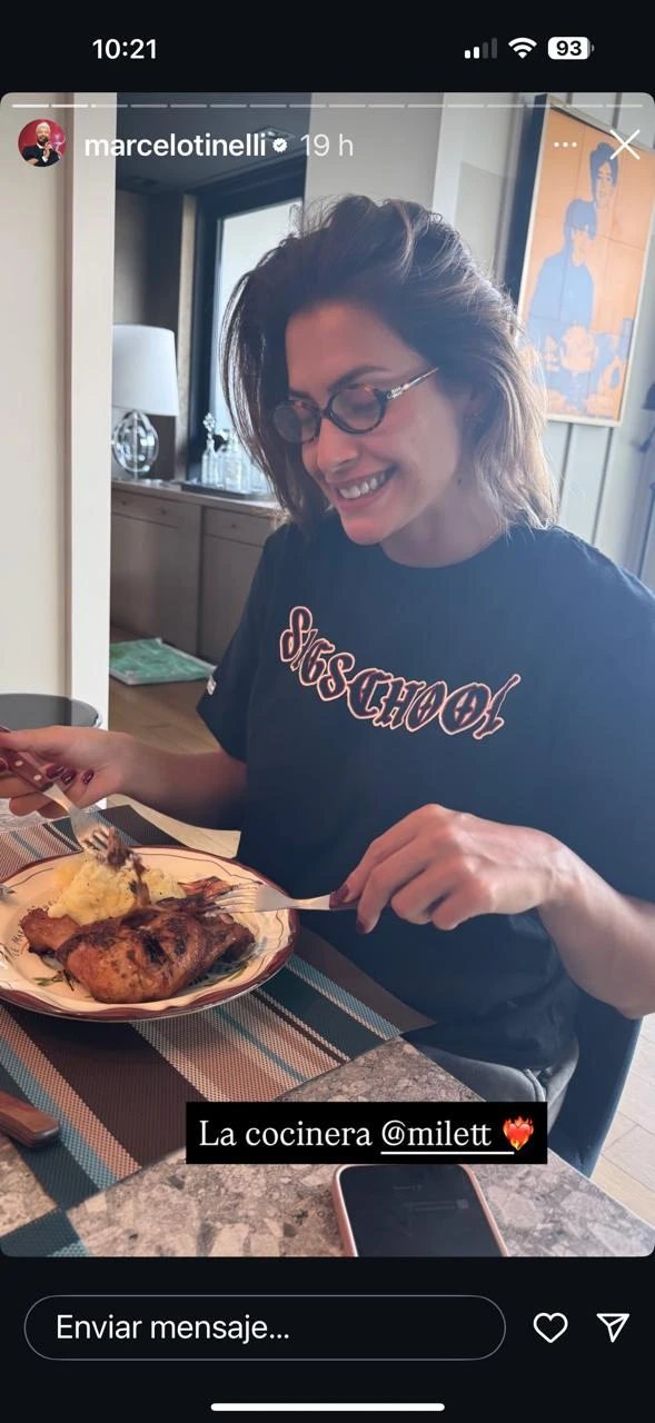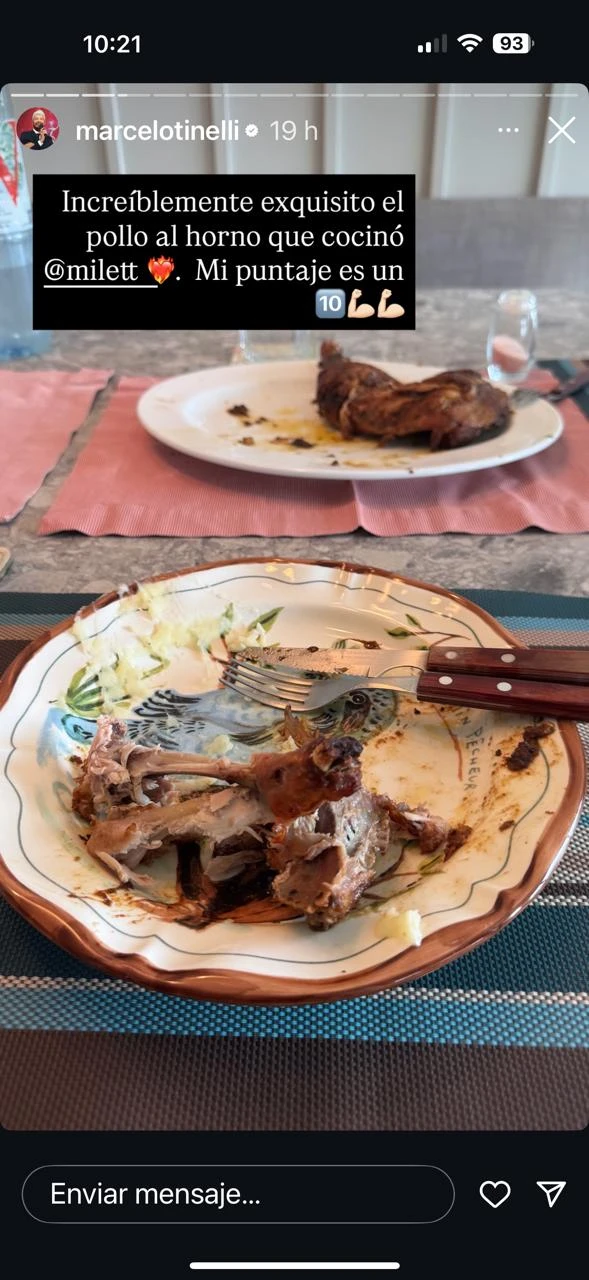 “El pollo al horno con puré de papas que cocinó Milett. Primera vez que lo hace. Veremos cómo salió. Ya les cuento”, escribió Marcelo entre sus historias y sobre una imagen de un plano general de la mesa puesta con individuales y platos con ilustraciones pintadas.